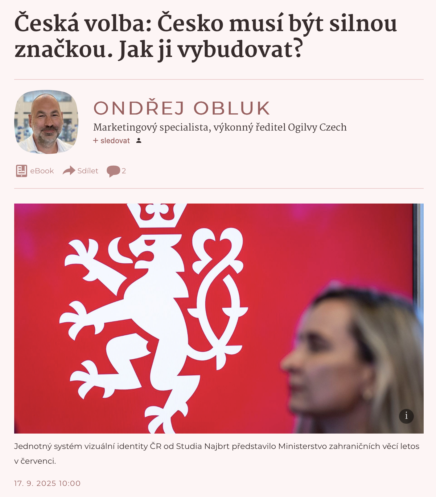 CEO of Ogilvy, Ondřej Obluk, comments in Seznam Zprávy on why Czechia should be a strong brand and what this means for the country and its future position at home and internationally. As part of the Česká volba series, he explores the importance of consistent communication, clear values, and a long-term strategy in building a confident national identity.
