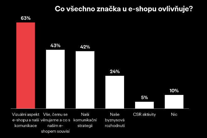 Logo a název má podle svého tvrzení 96 % z dotázaných e-shopů, 71 % má vlastní vizuální identitu, 40 % má zakotvené hodnoty, 39 % misi a vizi a 30 % pracuje se symboly značky. Bezmála polovina (44 %) má značku zpracovanou pouze ve vizuální formě (kombinace logo a název plus vizuální identita). Oproti tomu kompletní brandovou strategii má zpracovanou jen 16 %, nejméně častý je positioning (14 %). Téměř polovina (48 %) e-shopů z těch, které značku mají, se o ni nijak nestará. Značka se propisuje do všeho, co e-shop má nebo dělá, jen u 43 % respondentů. Celkově značka nejčastěji ovlivňuje vizuální aspekt e-shop a komunikace (63 %). U 10 % e-shopů značka dokonce neovlivňuje vůbec nic.